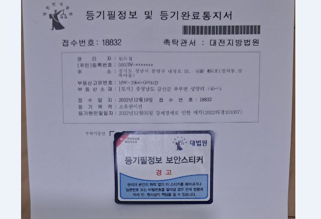 12월 28일, 등기필정보(등기필증)를 수령하며 소유권 이전이 완료되었습니다. 등기부등본을 확인하여 소유자 성명·지분·갑구·을구 변동을 점검하고, 향후를 위해 등기완료통지서와 함께 보관하세요.
