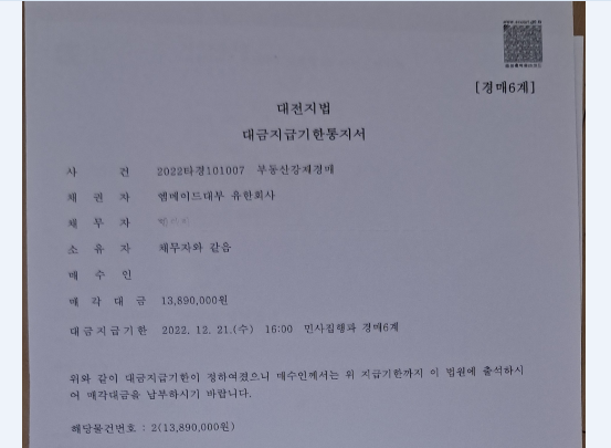 2022년 11월 9일, 법정에서 최고가매수신고인으로 불리며 낙찰이 확정되었습니다. 하지만 이때는 아직 소유권이 내 이름으로 넘어오지 않았습니다. 곧 내려질 매각허가결정이 확정되고 나서야 대금 납부기한 통지서가 도착합니다.