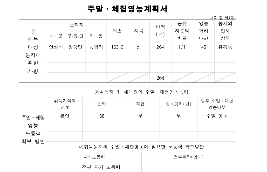 본격적인 농업경영이 아닌 주말·체험영농 목적으로 농지를 취득하려면 반드시 주말·체험영농계획서(별지 제4호의2서식)를 제출해야 한다. 이 문서에는 농지 현황, 노동력 확보, 농기계 보유·계획, 자금 조달, 재배 작물과 영농 시기 등을 구체적으로 적는다.