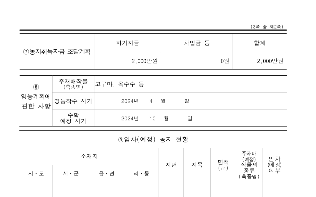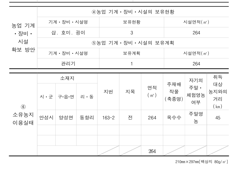 실제 사례: “안성시 양성면 전 264㎡, 현재 휴경 중, 주말마다 옥수수·고구마 재배, 관리기 1대 추가 구입 예정, 자금 2천만 원 자기자금 충당” 등 구체적으로 적어야 신뢰를 얻는다.