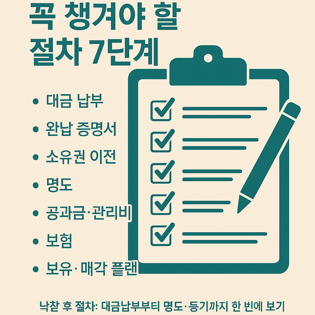 낙찰은 출발점일 뿐입니다. 대금 납부, 소유권 이전, 인도(명도), 세금 신고, 관리 전환까지 ‘사후 처리’가 투자 성패를 가릅니다. 라바김 실무 기준으로, 초보자도 놓치지 않게 7단계로 정리했습니다.